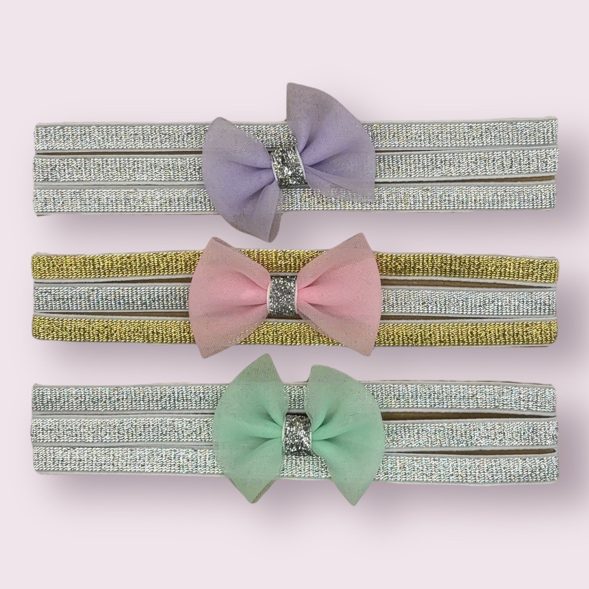 Introducing our Glitter Bow Head Wrap 3 Pack! Stay stylish with these shimmering head wraps, featuring a cute bow design. Available in green and silver, purple and silver, and pink and gold color combinations. The perfect accessory for any outfit.