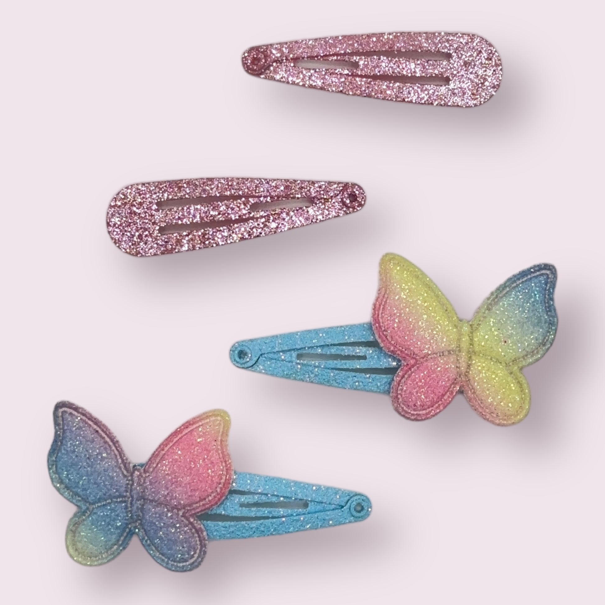 Transform your hairstyle with our Rainbow Butterfly Clip Set! The pack includes 2 pink glitter clips and 2 glitter rainbow butterflies on blue clips. Perfect for any occasion, these clips are sure to impress.