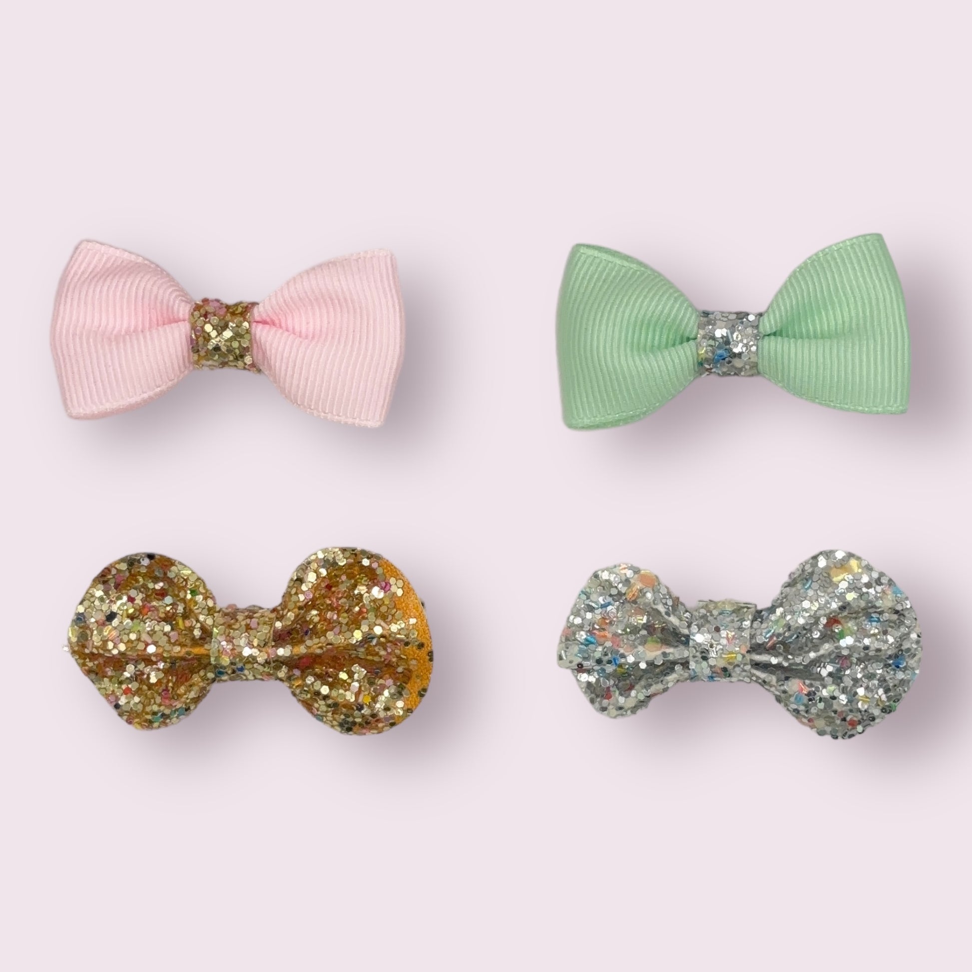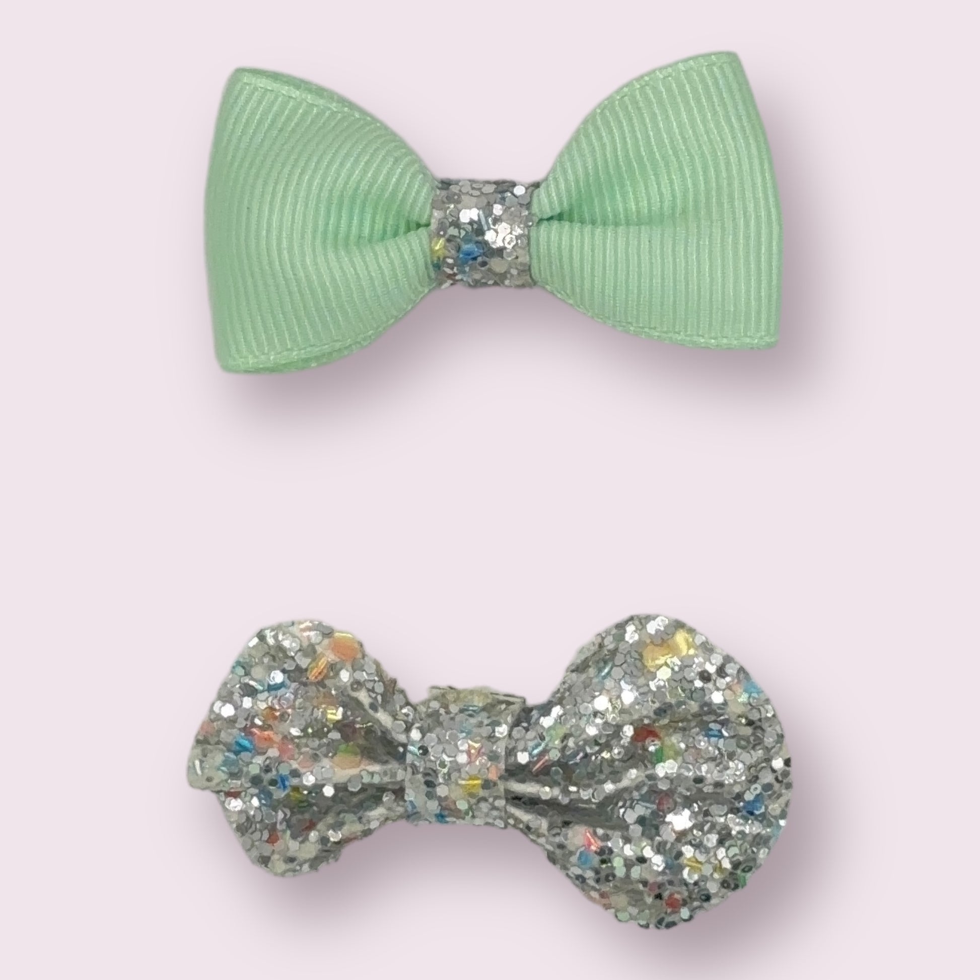 Add a touch of sparkle to any look with our Small Glitter Bow Clip 2 Pack! These cute bows come in two color combinations, pink and glitter gold or green and glitter silver, to match any outfit. Perfect for adding a pop of color and shine to your hair.